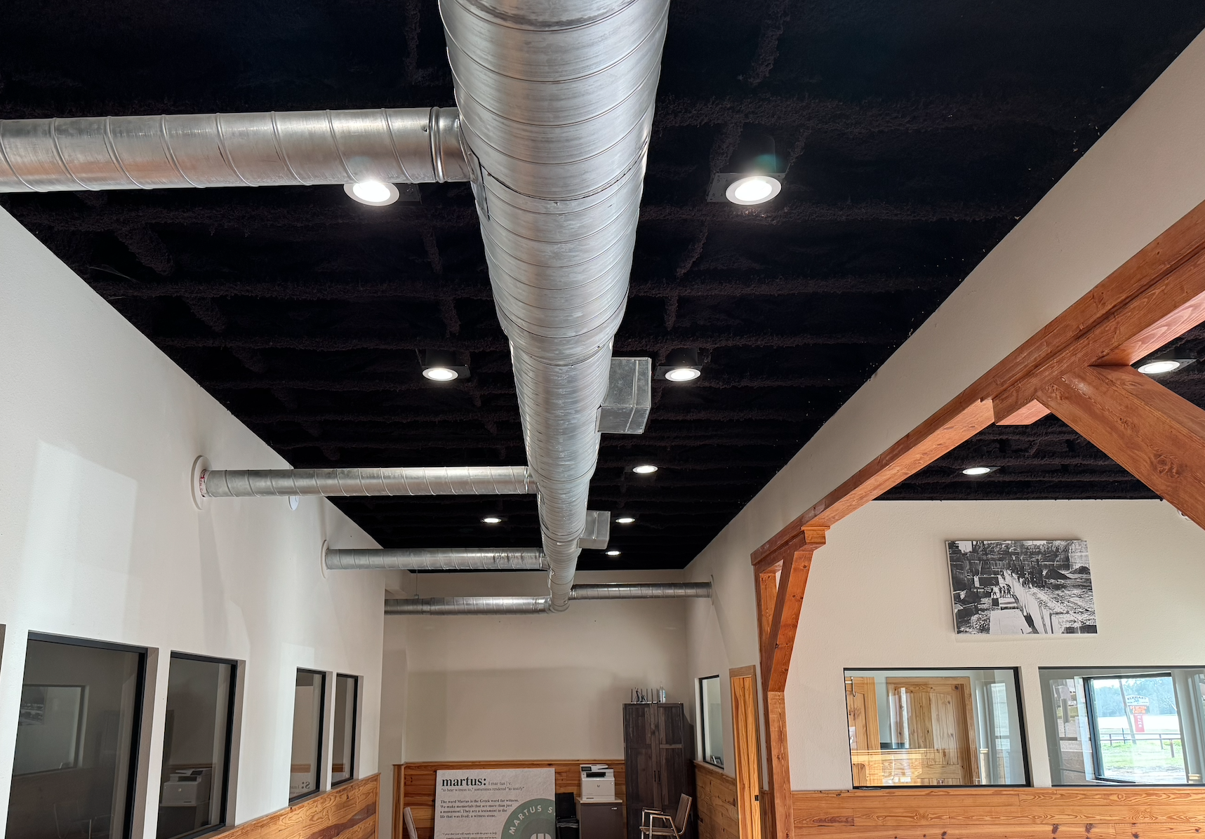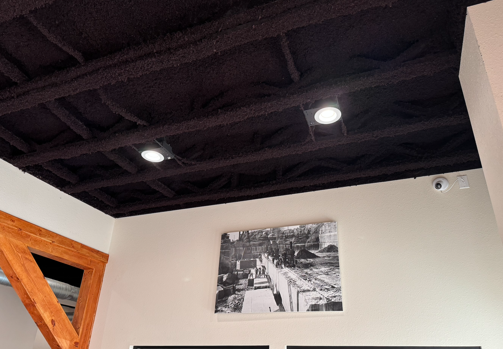 K-13 is spray-applied in an even layer onto exposed ceilings and overhead surfaces. It adheres directly and conforms to irregular shapes, beams, and ductwork, forming a seamless, acoustic-absorbing finish. It’s ideal for spaces where insulation needs to perform and be visible at the same time.